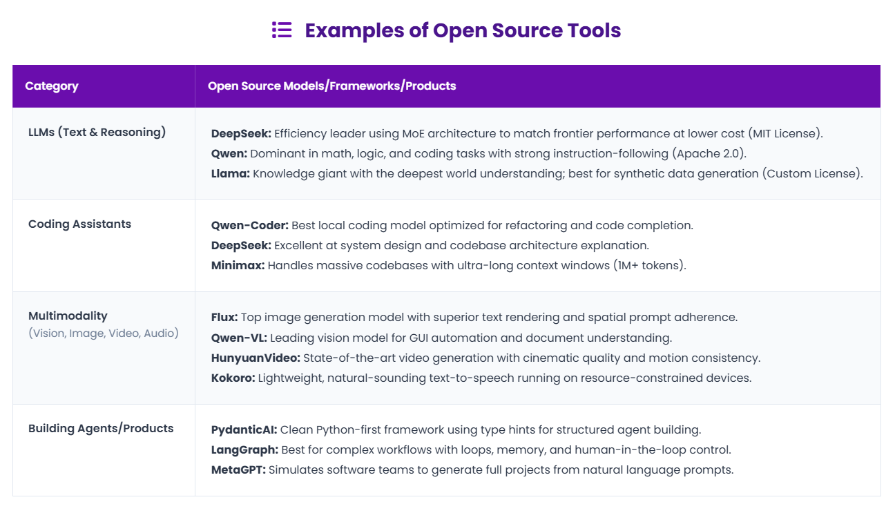 I’ll be sharing a deeper video on this soon, but in the meantime, I highly recommend exploring some of the open-source models and tools out there. I put together a table of open-source products and models and it’s a great starting point if you want to get your bearings.
